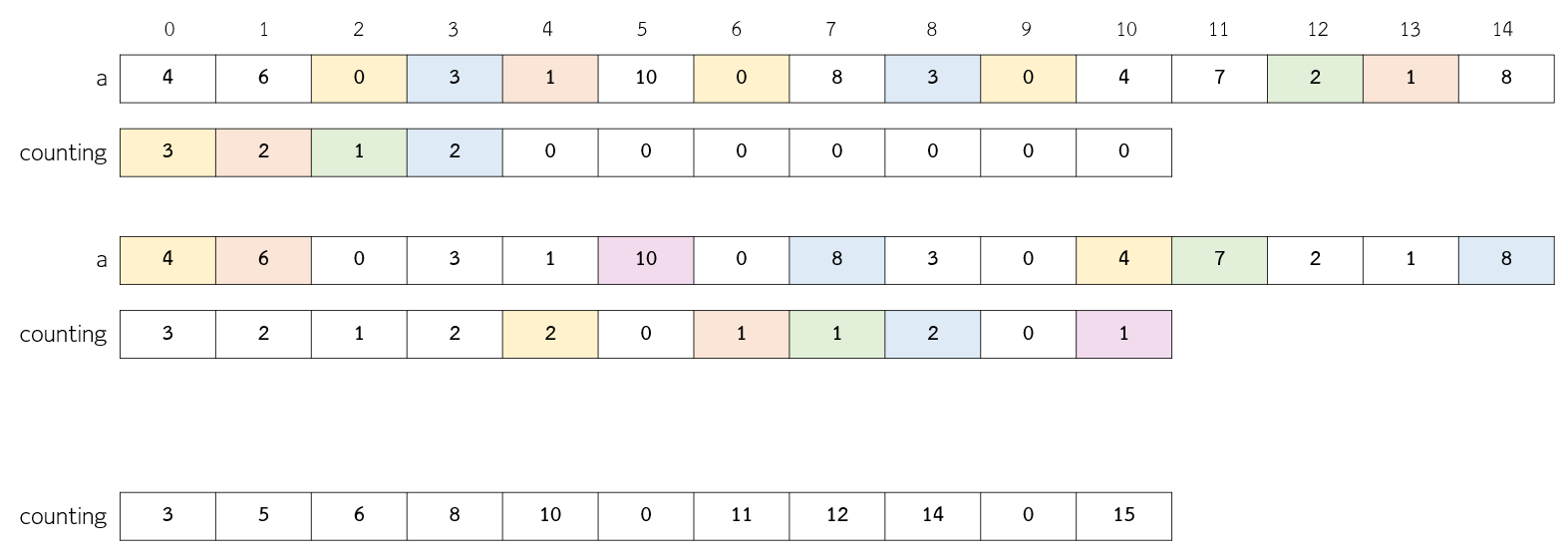 for(int i = n-1; i >= 0; i--) b[--counting[a[i]]] = a[i];