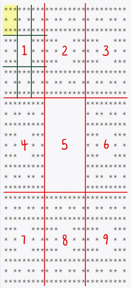 - divstar(arrays, x, y, n) : arrays์ ํฌ๊ธฐ n, (x, y)์ขํ๊ฐ ์ ๋ฌ๋๋ฉด arrays์ (x, y) ์์น๋ถํฐ n/3 ํฌ๊ธฐ์ 9๊ฐ ์ฌ๊ฐํ์ผ๋ก ๋๋ ์ ๊ฐ์ด๋ฐ ์ฌ๊ฐํ์ blank()๋ฅผ, ๋๋จธ์ง ์ฌ๊ฐํ์ ๊ฐ ๊ผญ์ง์ ์ขํ๋ก star() ํธ์ถ