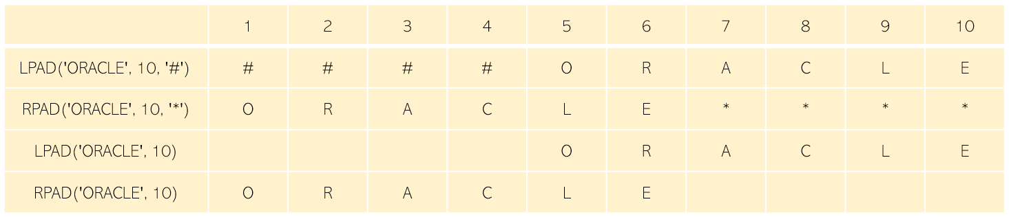 (4) RPAD('ORACLE', 10) : ์ค๋ฅธ์ชฝ ๋จ์ ์๋ฆฌ๋ฅผ ๊ณต๋ฐฑ์ผ๋ก ์ฑ์